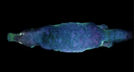 Another strange feature: its fur is fluorescent! The platypus is biofluorescent: its fur emits a blue-green glow when exposed to