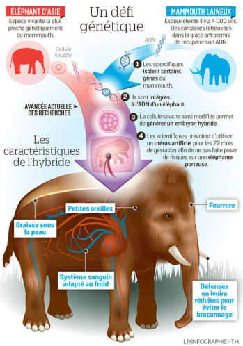 Depuis 2015, les équipes du généticien George Church, à l'université de Harvard, ont pour objectif de produire un embryon hybride entre un éléphant et un mammouth, grâce au ciseau moléculaire Crispr Cas9 (Prix Nobel de chimie 2020) qui permet de couper l'ADN à l'endroit voulu. Ils pourraient aussi extraire et remplacer certaines parties du génome d'un éléphant d'Asie par des fragments d'ADN issus de mammouths conservés quasi intacts dans la glace de Sibérie.