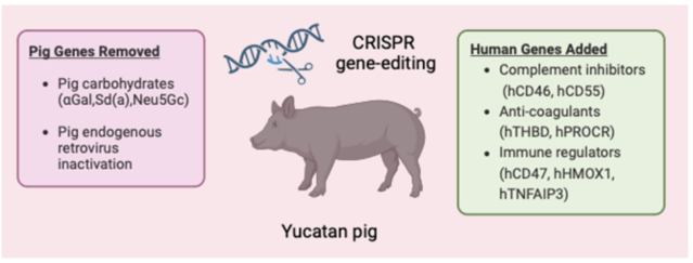 modified pig heart on a 57-year-old man: 3 genes were removed to limit rejection of the heart by the transplanted human, 6 human genes were added to the pig heart and 1 gene was added