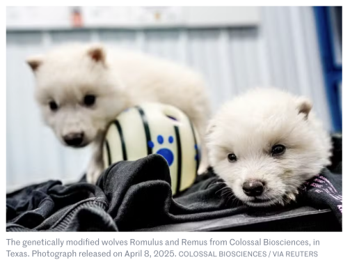 Ancient DNA was extracted from fossils: a 13 000 year old tooth and a 72 000 year old skull. The genome sequence of these genitically modified wolves is 99.5% identical to the one of the gray wolf, meaning that only 12 million base pairs of the DNA sequence are different. An edifying DNA system was used on gray wolf blood cells. The genetically modified nuclei were injected into dogs eggs whose nuclei had been removed. The surrogate dogs are big in order to be able to give birth to the GMOs. These wolves are expected to be 25% larger than the current species and have a lighter coat. The start up goes on working on the ressurection of the woolly mammoth, the dodo and the Tasmanian tiger... 04/25