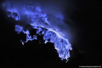 A en croire les réseaux sociaux, il existe sur l'île de Java en Indonésie un volcan qui crache de la lave bleue! En fait le bleu électrique, ce n'est pas de la lave. Ce volcan appelé le Kawah Ljien émet en permanence, outre de la vapeur d'eau, des gaz toxiques tels que du dioxyde de soufre, du sulfure d'hydrogène et de l'acide chlorydrique. Au centre du cratère, se trouve le lac le plus acide du monde avec un pH de 0.2. Kawah Ljen signifie cratère vert en javanais. Le volcan doit ce caractère verdâtre à la présence de fumerolles (solfatares émettant de grandes quantités de soufre). Emis sous forme de gaz à 200 degrés Celcius, le soufre se refroidit et cristallise peu à peu donnant la couleur jaune-orange au volcan. La couleur bleue est due à la combustion du soufre liquide particulièrement le disulfure. Cette combustion nécessite une température de 700 degrés C, ce qui n'est pourtant pas la température à la surface du volcan. L'Homme est à l'origine de la combustion du soufre. Chaque jour, des mineurs montent jusqu'au sommet du volcan munis de paniers qu'ils remplissent de soufre solide afin de le vendre (à très bas prix, une charge de 80 kilos représente une paie de 4 euros). En plus, de la toxicité des gaz émis par le volcan, en saison sèche, la température est insupportable. Ainsi, les mineurs, dont l'espérance de vie ne dépasse pas 40 ans, ont peu à peu développé un système d'extraction, qu'ils utilisent durant la nuit. Ils augmentent la production du minerai grâce à un système de tuyaux métalliques qui, placé au niveau des fumerolles, canalise les vapeurs de soufre, les refroidit et favorise leur passge à l'état liquide. Les mineurs, munis de leurs torches, enflamment le fluide pour travailler la nuit malgré l'obscurité de la nuit.