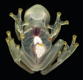 The glass frog hides its red blood cells to get even more transparent during its sleeping time! You can see its internal organs, such as its heart, liver and intestines. Scientists have shown that these nocturnal frogs store 90% of their red blood cells in their liver during the day, so light passes through their bodies 2 to 3 times better. This enables them to hide in the vegetation under the leaves. The scientists