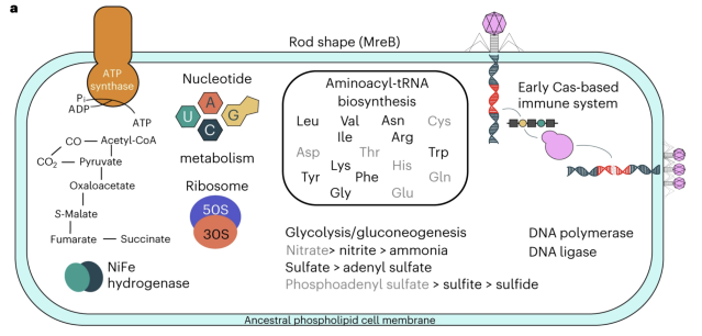 Reconstitution de génome de l'ancêtre universel, cette petite cellule qui vivait il y a environ 4 milliards d'années. The nature of the last universal common ancestor (LUCA), its age and its impact on the earth system have been the subject of vigorous debate across diverse disciplines, often based on disparate data and methods. Age estimates for LUCA are usually based on the fossil record, varying with every reinterpretation. The nature of LUCA's metabolism has proven equally contentious, with some attributing all core metabolims to LUCA, whereas others reconstruct a simpler life form dependent on geochemistry. Here is intered that LUCA lived 4.2 Ga (4.09-4.33) through divergence time analysis of preLUCA gene duplicates, calibrated using microbial fossils and isotope records under a new cross- bracing implementation. Phylogenetic reconcilation suggests that LUCA had a genome of a least 2.5 Mb encoding around 2600 proteins, comparable to modern prokaryotes. The results suggest LUCA was a prokaryote- grade anaerobic acetogen that possessed an early immune system. Indeed, 19 genes were already associated to CRISPR Cas 9 system as a primitive immune system. Altough LUCA is sometimes perceived as living in isolation, it's infered that LUCA was part of an established ecological system. The metabolism of LUCA would have provided a niche for other microbial community members and hydrogen recycling by atmospheric photochemistry could have supported a modestly productive early ecosystem. 07/24