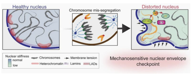 Incorrect chromosome segregation during cell division leads to abnormalities that disrupt cell function. Cells with abnormal chromosome numbers consequently activate mechanisms to prevent their propagation. A study reveals how these chromosomal abnormalities are detected. These results highlight a novel role for the mechanics of the nucleus in this process. Aneuploidy, a condition in which cells have an incorrect number of chromosomes, is observed in 90% of solid tumors. It results from errors in the segregation of chromosomes from the mother cell to the two daughter cells during mitosis and leads to the activation of p53, a key protein that prevents abnormal cells from dividing. When p53 is mutated, which occurs, on average in one in two cancers, theses cells can continue to divide, accumulate more mutations and, ultimately, lead to the development of cancer. A mechanoreceptive nuclear checkpoint causes cell cycle arrest after chromosome mis-segregation. Errors in chromosome segregation during mitosis lead to deformation and softening of the nucleus, reduced levels of heterochromain at the nuclear periphery and defects in laminate assembly. These alterations increase tension on the nuclear envelope of daughter cells, leading to activation of mTORC2 and ATR mechanoreceptors, triggering cell arrest in a p53 manner. 01/25