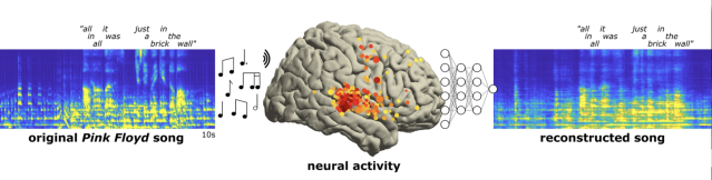 Brain recordings capture musicality of speech. Neuroscientists decode song from brain recordings, revealing areas dealing with rythm and vocals. They recorded electrical activity of the brain (yellow and red dots) as patients listened to the Pink Floyd song, "Another Brick in the Wall". Using artificial intelligence software, they were able to reconstruct the song from the brain recordings. This is the first time a song has been reconstructed from intracranial electroencephalography recordings. They could record the activity of electrodes placed on the brains of patients being prepared for epilepsy surgery in order to capture the elctrical activity of brain regions tuned to attributes of the music (tone, rhythm, harmony and words) to see if they could reconstruct what the patient was hearing. For people who have trouble communicating, whether because of stroke or paralysis, such recordings from electrodes on the brain surface could help reproduce the musicality of speech that's missing from today's robot-like reconstructions. 08/23